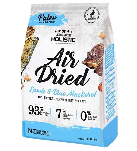 طعام القطط الجاف المجفف بالهواء من أبسولوت هوليستيك بنكهة سمك الماكريل الأزرق ولحم الضأن - 500 غرام