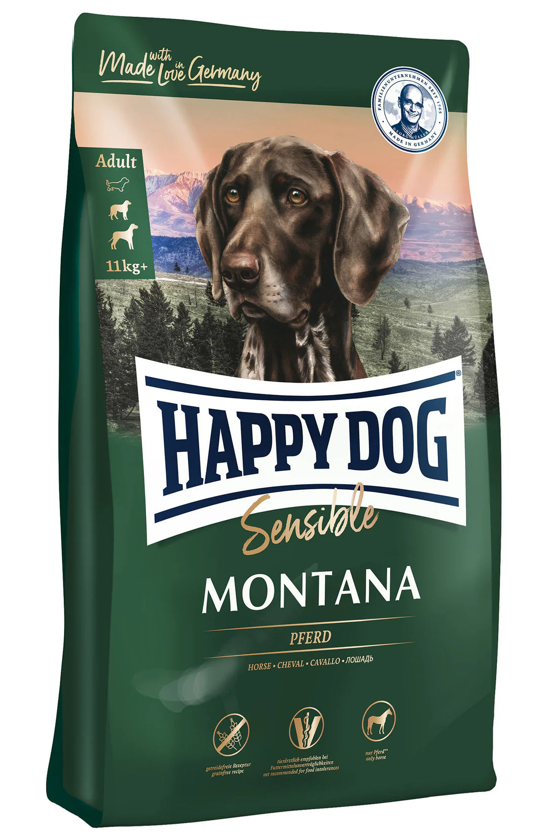Grain-free complete food with horse meat for sensitive gourmet dogsDo you want to pamper your four-legged friend with a real treat? Or do you have a dog with food sensitivities who often has digestive problems or problems with their skin and coat? This may be due to a food intolerance. Single-source protein from horsemeat, and gluten-free potato, make Happy Dog Montana a real taste experience for dogs, including sensitive dogs. Potato contains no gluten, so it can be fed to pets who are grain intolerant. Horsemeat is an unusual and select protein source, and so is very well tolerated. Valuable Omega-3 and Omega-6 fatty acids – important for a healthy skin and shiny coat – round off this exclusive recipe. This makes Supreme Sensible Montana an ideal and balanced dry food for dogs with allergies and food sensitivities.The exceptionally tasty super premium Happy Dog Montana Complete Food is also ideal for all choosy, gourmet adult dogs up to 11kg, who need variety or are very hard to please.Composition:- Composition