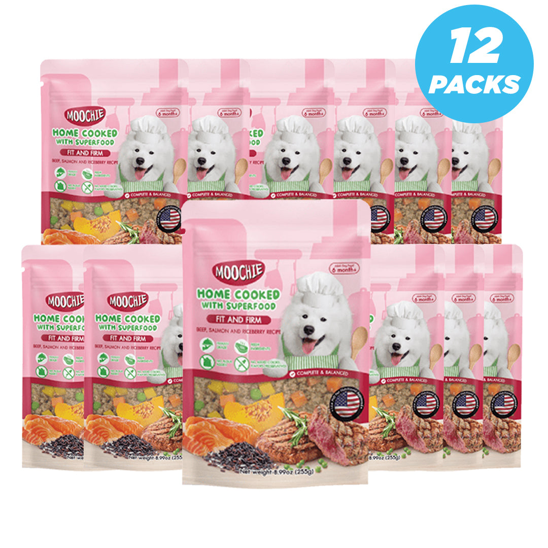 Moochie Home Cooked Dog Food - Fit and Firm - Beef, Salmon and Riceberry Recipe 255g Pack of 12
